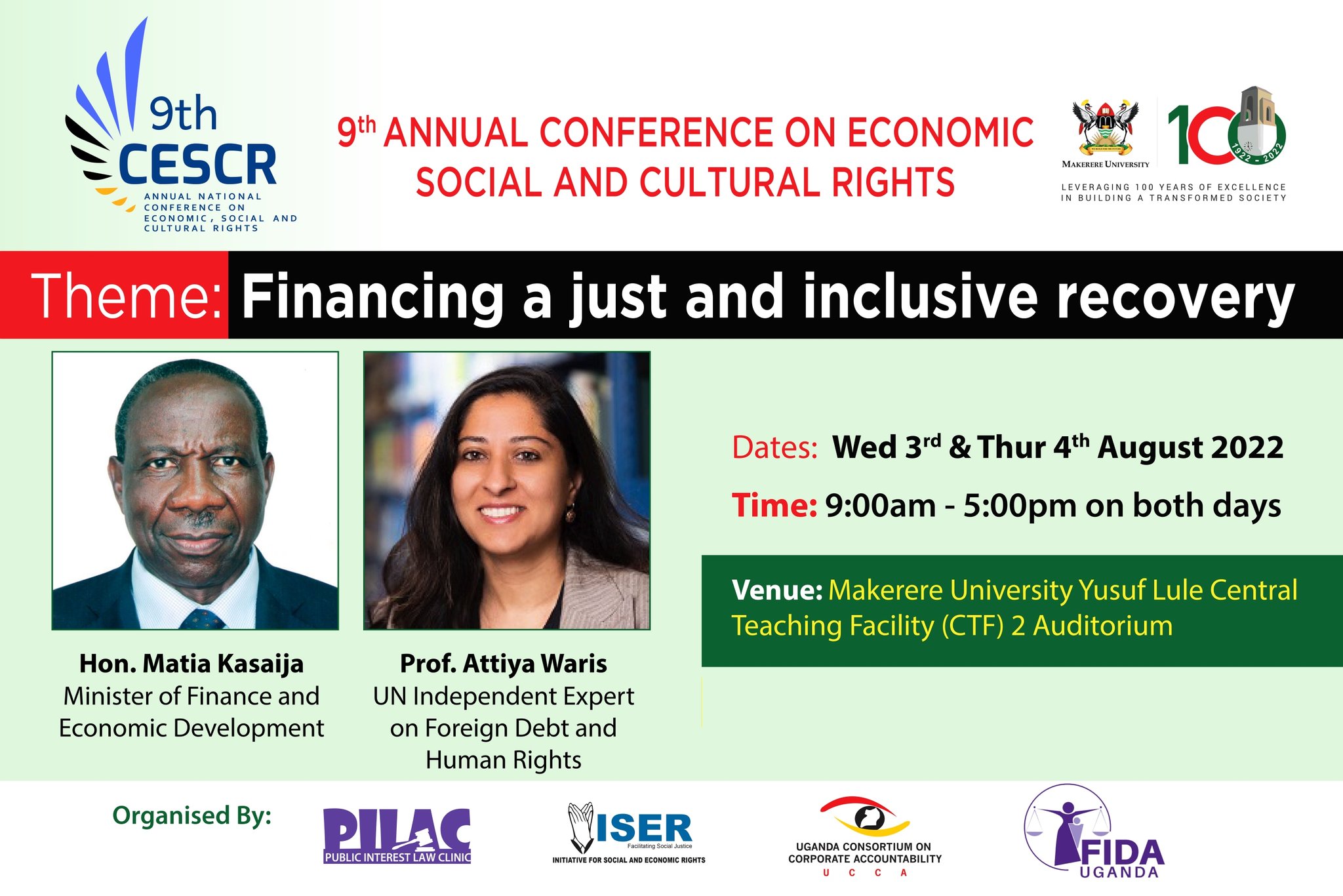At the 1st Conference in September 2014, the question of the justifiability of ESCRs took center stage. The 2nd Conference in September 2015 confronted the subject of the state of socio-economic services, focusing particularly on the issue of exclusion and vulnerability. The subject of development planning and use of the Human Rights Based Approach featured prominently at the 2nd Conference. The subject of business and human rights was flagged as a serious issue. One of the outcomes of the 2nd Conference was the birth of the Uganda Consortium on Corporate Accountability (UCCA) including a decision that the 3rd Conference should address the subject of business and human rights, thus the theme of the Conference It is against this background that the theme of the Conference should be understood. The Theme was informed by the fact that some businesses have responded to human rights challenges by engaging in corporate social accountability. The 4th Conference dealt with the role of local government in service delivery. The 5th Conference dealt with the critical issue around SDGs. The 6th conference was held under the theme strengthening Access to Justice for economic social and cultural rights. The 7th Annual National Conference on Economic, Social and Cultural Rights had a theme on Election Promises, Political Accountability and Service Delivery: A Reality Check.
